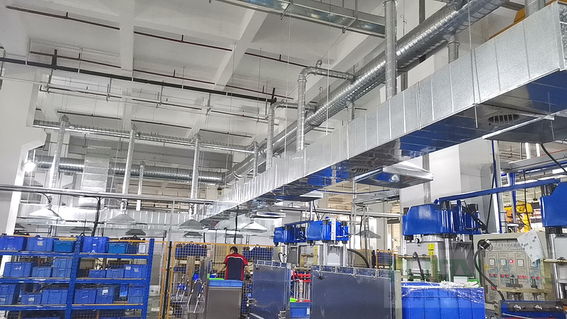 方案二,廠房內生產人員較少,設備少,預算緊張時,可考慮用崗位定點降溫。這時根據人員、設備分布的位置,用蒸花式水冷空調連接通風管,把冷風引至每個生產人員的位置,定點定位給員工降溫。在員工的頭頂有28度的冷風一直吹,工人就不會有悶熱的體驗這種方案投入少,運行成本低,但只是有人的位置涼快,沒有人的位置不好意思,它就是會熱。